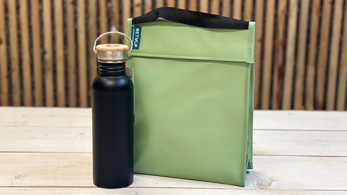 Het Retulp Lunch2Go pakket is de ideale duurzame combinatie voor onderweg, op kantoor of tijdens een picknick. De set bestaat uit een Retulp Urban waterfles van 750 ml in stijlvol zwart en een frisgroen koeltasje, gemaakt van gerecycled materiaal uit oude koelkasten.